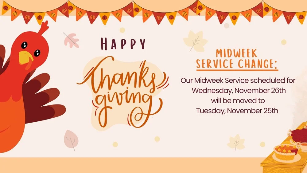 Our Midweek Service scheduled for Wednesday, November 26th will be moved to Tuesday, November 25th to allow everyone time to prepare for Thanksgiving with family and friends. We look forward to seeing you on Tuesday, November 25th. Wishing you a joyful Thanksgiving!